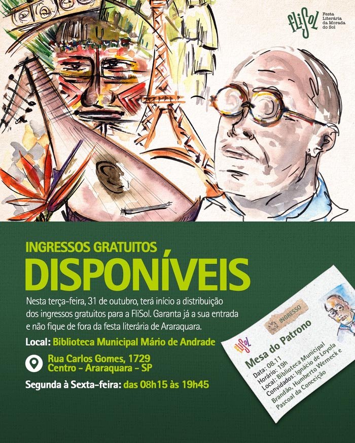 Ingressos – Para todas as mesas que serão realizadas na Biblioteca Municipal Mário de Andrade, os convites gratuitos começarão a ser distribuídos nesta terça-feira, 31 de outubro, no horário das 8h15 às 19h45, de segunda à sexta-feira. A Biblioteca Pública Municipal Mário de Andrade está localizada na Rua Carlos Gomes, 1729, no Centro de Araraquara.