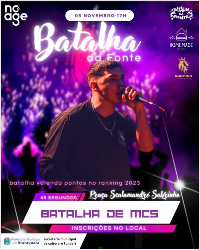 A Batalha da Fonte acontece neste domingo (05) na Praça Scalamandré Sobrinho, ao lado da pista de skate, com início às 17 horas. Com programação gratuita, a Batalha da Fonte conta com o apoio da Prefeitura de Araraquara, por meio da Secretaria Municipal da Cultura e Fundart.
