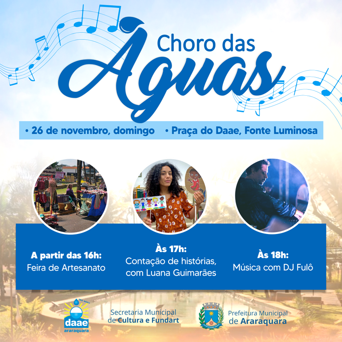 A programação é realizada na Praça do Daae – Fonte Luminosa, a partir das 16 horas. O Choro das Águas tem início com a feira de artesanato que reúne empreendedores e artesãos de Araraquara e região, com trabalhos manuais bem elaborados e que são fonte de renda para muitos expositores.