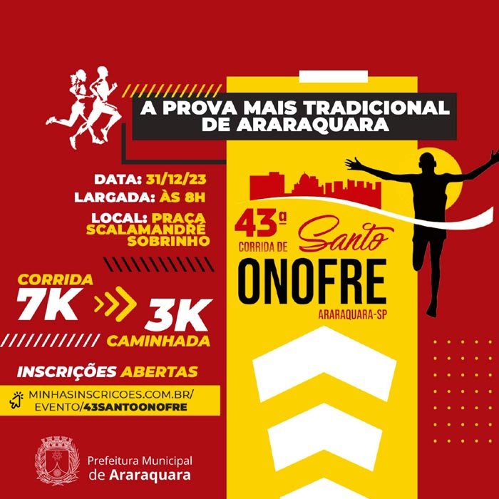 A Prefeitura de Araraquara, por meio da Secretaria Municipal de Esportes e Lazer, abriu as inscrições para a edição 2023 da Corrida de Santo Onofre, prova de rua mais tradicional de Araraquara, que é disputada sempre no último dia do ano e chega à sua 43ª edição.