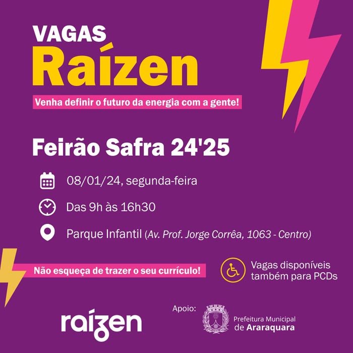Em parceria com a Prefeitura de Araraquara, através da Secretaria Municipal do Trabalho, Desenvolvimento Econômico e Turismo, a empresa Raizen realizará na próxima segunda-feira, dia 8 de janeiro, o Feirão de Emprego para a Safra 2024/2025, que se inicia em fevereiro/março.