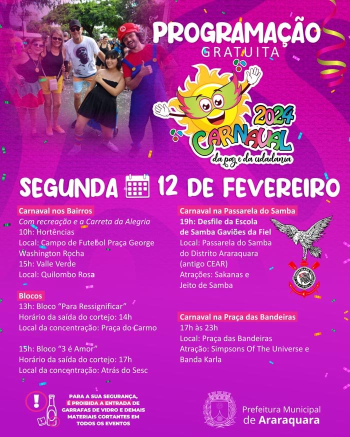 A programação completa do Carnaval da Paz e Cidadania 2024 é totalmente gratuita e pode ser conferida no site da Prefeitura de Araraquara. É proibida a entrada com garrafas de vidro ou qualquer outro material cortante nos espaços da festa.