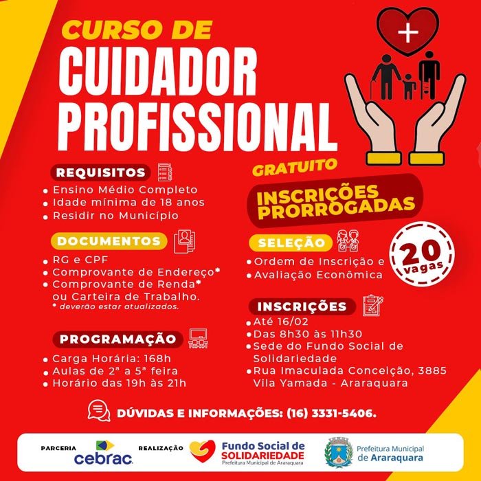 Será concluído nesta sexta-feira (16) o prazo de inscrições para o Curso de Cuidador Profissional promovido pelo Fundo Social de Solidariedade de Araraquara e Cebrac Araraquara. A capacitação é gratuita e voltada para quem se identifica e gosta de cuidar de pessoas, assim como para quem pretende mudar de área profissional ou se aperfeiçoar na sua área.
