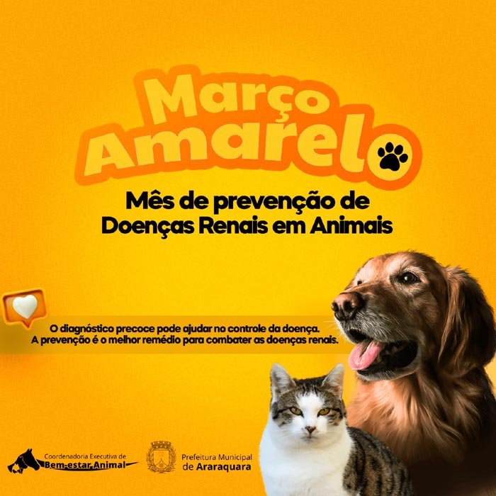 O "Março Amarelo" é uma campanha inserida no calendário de meses temáticos de ações que visam a saúde e bem-estar dos animais. Essa ação alerta para os cuidados e para a prevenção de doenças renais dos pets, por isso é colorido de amarelo.