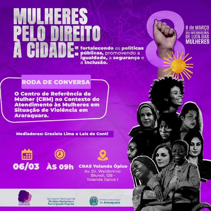 Nesta quarta-feira (6), duas atividades movimentam a programação do Mês da Mulher em Araraquara, que traz o tema "Mulheres pelo direito à cidade: fortalecendo as políticas públicas, promovendo a igualdade, a segurança e a inclusão". Totalmente gratuita, a programação acontece entre os dias 5 e 28 de março, com atividades em várias frentes: palestras, rodas de conversas, formação, jogos de basquete, ciclo de estudos feministas, exibição de documentário, inauguração da Casa da Mulher Paulista, clube de leitoras, oficina de defesa pessoal, entre outras.
