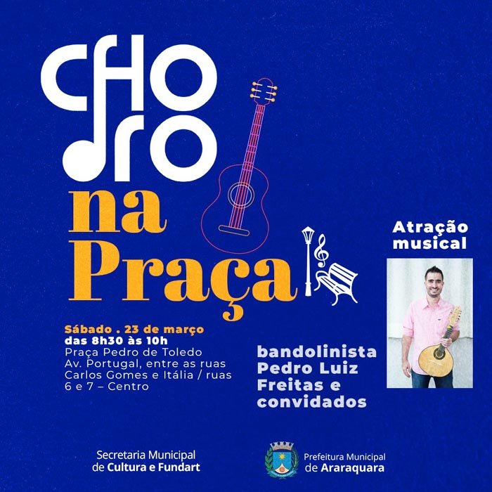 O projeto Choro na Praça tem início neste sábado, 23 de março, gratuitamente na Praça Pedro de Toledo, em uma realização da Secretaria Municipal de Cultura e Fundart, por meio da Coordenadoria de Acervos e Patrimônio Histórico. Pedro Luiz Freitas e convidados levam o choro para a praça das 8h30 às 10 horas, durante a Feira de Orgânicos que acontece no local.