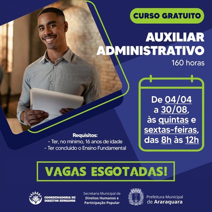 A Prefeitura de Araraquara, por meio da Coordenadoria de Direitos Humanos, que integra a Secretaria de Direitos Humanos e Participação Popular, comunica que preencheu todas as vagas colocadas à disposição para os cursos gratuitos de almoxarife e auxiliar administrativo.