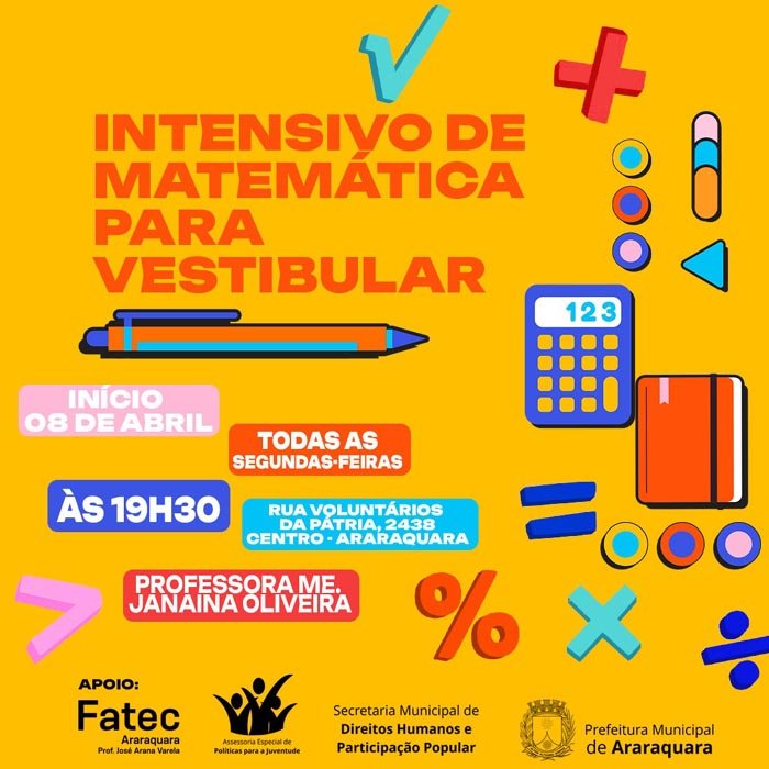 A Prefeitura de Araraquara, por meio da Assessoria de Políticas para a Juventude, que integra a Secretaria de Direitos Humanos e Participação Popular, fechou uma parceria com a Faculdade de Tecnologia (Fatec) de Araraquara para a realização do curso "Preparatório Intensivo de Matemática para o Vestibular", que será ministrado na Secretaria de Direitos Humanos e Participação Popular. Com vagas limitadas, o curso é gratuito e será realizado nos meses de abril e maio de 2024.
