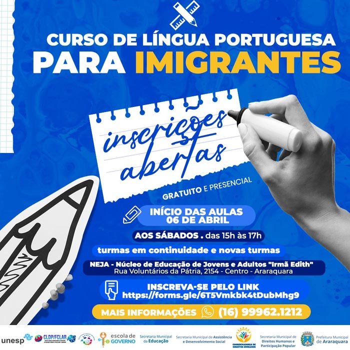 As inscrições do Curso de Português para Imigrantes podem ser feitas pelo link bit.ly/portugues_imigrantes_aqa. Mais informações podem ser obtidas pelo telefone (16) 99962-1212.