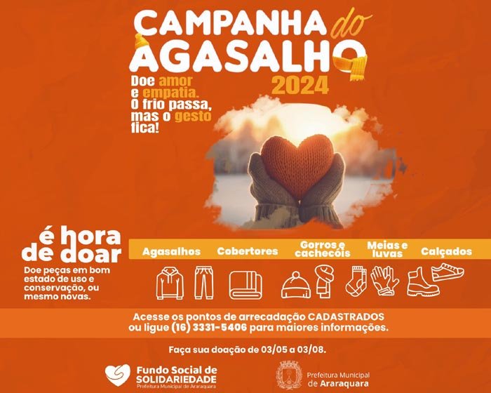 A Campanha do Agasalho 2024, ação que tem o objetivo de arrecadar itens de inverno para serem distribuídos às pessoas em situação de vulnerabilidade social de Araraquara, já tem data para acontecer. Com o tema "Doe amor e empatia. O frio passa, mas o gesto fica", a iniciativa entrará em ação entre os dias 3 de maio e 3 de agosto, e é organizada pelo Fundo Social de Solidariedade de Araraquara com apoio de diversos empresários.