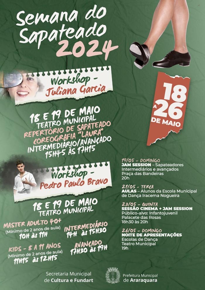 A Secretaria Municipal de Cultura e a Fundart realizam a Semana do Sapateado no período de 18 a 26 de maio, com programação gratuita. As inscrições para os workshops e também para as escolas e grupos que desejem se apresentar no dia 26 já estão abertas.