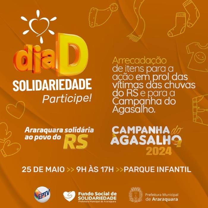 No próximo sábado, 25 de maio, Araraquara se unirá em mais um esforço de solidariedade com o "Dia D", que visa arrecadar doações para duas ações sociais realizadas pela Prefeitura de Araraquara por meio do Fundo Social de Solidariedade: a campanha em prol da vítimas dos temporais do Rio Grande do Sul e a Campanha do Agasalho. A mobilização será realizada das 9h às 17h no Parque Infantil, com o caminhão estacionado na Av. Professor Jorge Corrêa, entre as ruas São Bento (3) e Padre Duarte (4).