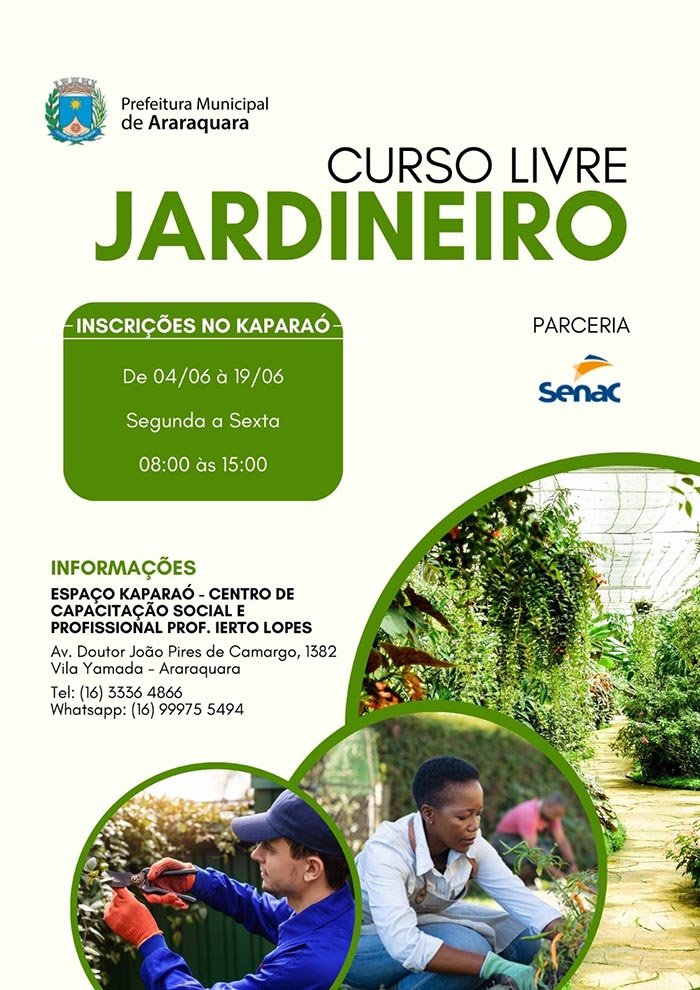 As inscrições para 30 vagas no curso livre gratuito de Jardineiro estão abertas no Espaço Kaparaó, Centro de Capacitação Social e Profissional “Prof. Ierto Lopes”, ligado à Coordenadoria Executiva do Trabalho e de Economia Criativa e Solidária da Secretaria Municipal de Trabalho, Desenvolvimento Econômico e Turismo. O curso é oferecido pela Prefeitura de Araraquara, em parceria com o Senac Araraquara.