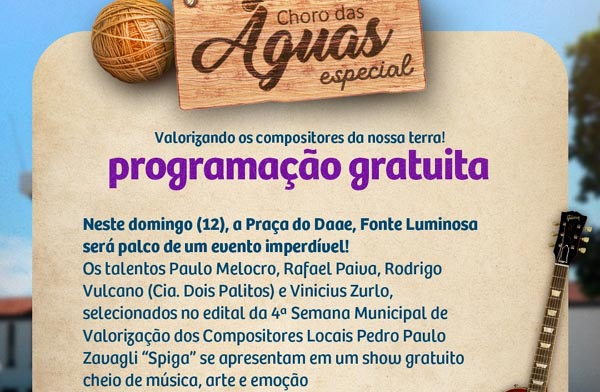 Paulo Melocro, Rafael Paiva, Rodrigo Vulcano (Cia. Dois Palitos) e Vinicius Zurlo levam suas composições para o Choro das Águas. O evento tem início às 16h com a feira de artesanato, sendo os shows musicais a atração das 18h, com classificação livre.