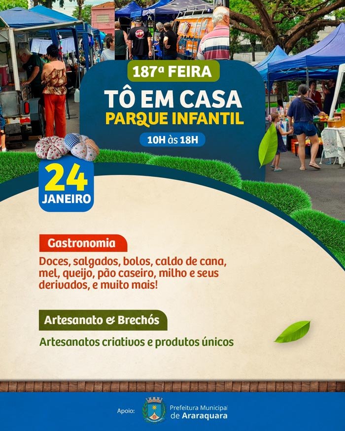 A Feira Tô em Casa é realizada pelo Coletivo Tô em Casa, com apoio da Prefeitura de Araraquara, por meio da Secretaria Municipal de Desenvolvimento Econômico, via Subsecretaria do Trabalho e da Economia Criativa e Solidária.