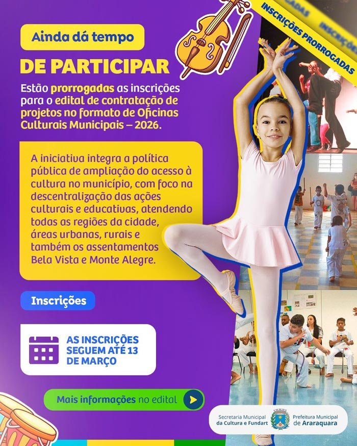Os interessados em ingressar no programa Oficinas Culturais Municipais têm um período maior para realizar suas inscrições: a Secretaria Municipal de Cultura e a Fundart prorrogaram o prazo até o dia 13 de março.