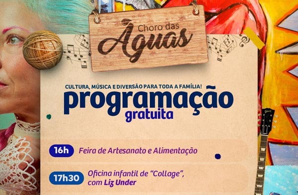A programação do Choro das Águas deste domingo (15) está especial: começa às 16h com a Feira de Artesanato; depois segue com a oficina infantil de “Collage”, às 17h30, com a artista premiada no Território da Arte, Liz Under; e se encerra com o show musical de Trouble Folks, às 18h, com show “Trouble num sonho antigo”. A programação gratuita, realizada pela Secretaria Municipal de Cultura e Fundart, é gratuita e é realizada na Praça do Daae – Fonte Luminosa.