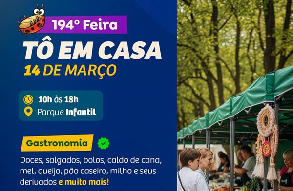 Com clima descontraído e ambiente familiar, a Feira “Tô em Casa” reúne expositores, moradores e visitantes da cidade em um espaço plural, criativo e cheio de vida. Entre os destaques estão os estandes de artesanato, bijuterias, doces, salgados, mel, queijos, pães, licores, caldo de cana, frutas, legumes, milho e derivados, além de muitas outras opções.