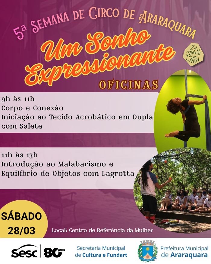 Neste sábado, 28 de março, a programação da 5ª Semana do Circo de Araraquara realiza duas oficinas gratuitas, abertas a todos interessados, sem necessidade de inscrição (é só chegar e participar!). Ambas serão realizadas no CRM - Centro de Referência da Mulher Heleieth Saffioti, na região central.