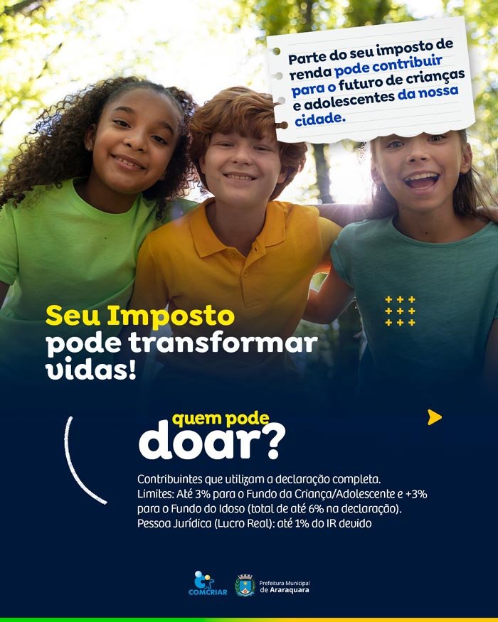 Em Araraquara, os contribuintes que utilizam a declaração completa podem destinar parte do Imposto de Renda para o Fundo Municipal dos Direitos da Criança e do Adolescente (FMDCA) e o Fundo do Idoso. Os valores são aplicados em projetos aprovados pelo Conselho Municipal dos Direitos da Criança e do Adolescente (COMCRIAR), executados por entidades regularmente registradas no município.