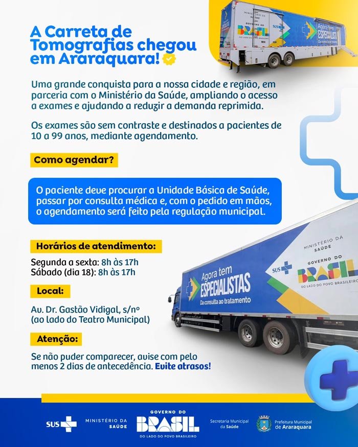 Araraquara foi um dos municípios selecionados para receber a carreta de exames de imagem tomografia do programa "Agora Tem Especialistas" do Ministério da Saúde. O equipamento estará na Av. Dr. Gastão Vidigal, s/nº, ao lado do Teatro Municipal, até o dia 15 de maio. As tomografias sem contraste serão realizadas de segunda a sexta-feira, das 8h às 17h. No sábado (18), o atendimento acontece no mesmo horário. A previsão é que sejam realizados cerca de dois mil procedimentos.