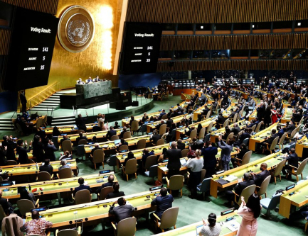 O placar foi de 141 países a favor, 5 contra e 35 abstenções