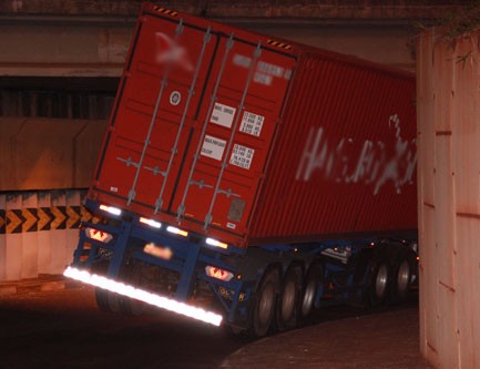 Veículo ficou prensado com algumas rodas suspensas até chegada do guincho