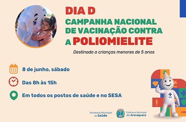 Saúde realiza Dia D da Campanha Nacional de Vacinação contra a Poliomielite neste sábado (8)