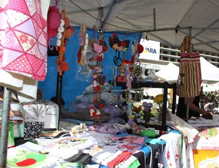 Tendas expostas em frente ao Paço Municipal oferecem diversas variedades, como jogos de toalhas e chinelos ornamentais