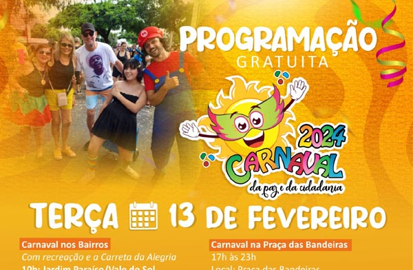 Programação do dia conta ainda com os blocos “3 é Amor” e “Para Ressignificar”, Carnaval nos Territórios e rock na Praça das Bandeiras