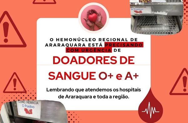 Hemonúcleo de Araraquara faz convocação urgente para doadores dos tipos O+ e A+